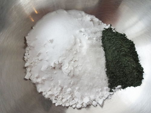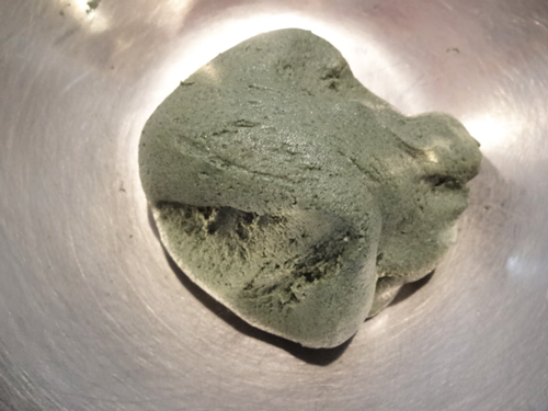 ボウルに上新粉と白玉粉、上白糖とよもぎパウダーを入れ、ぬるま湯を少しずつ加える。