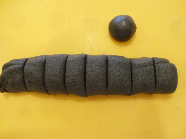生地がまとまったら、棒状に細長くのばし小さくカットして丸める。