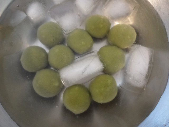 浮いてきてから3分茹で、氷水を入れたボウルにとる。