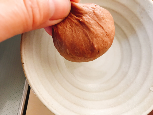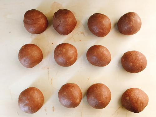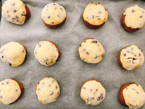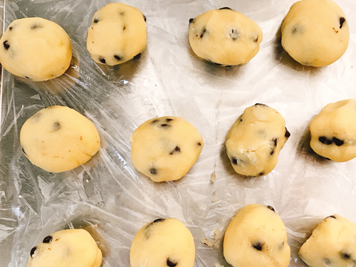 パン生地に手粉をして、パンチングをし、12等分にして、ベンチタイム15分。クッキー生地も12等分ずつにして丸めておく。