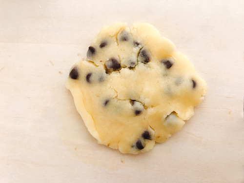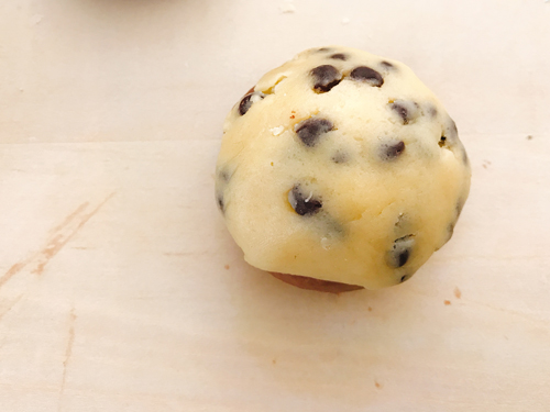 クッキー生地は5ミリくらいの厚さに伸ばし、パン生地のほうに軽く水をつけ、クッキー生地で包み込む。