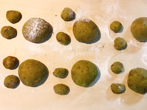 クッキー生地も6等分にする。6等分したクッキー生地からそれぞれ20gずつ取りさらにそれを10gに分けて全て丸めておく。