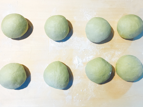 ガスを抜き8分割にして、濡れ布巾を掛けベンチタイム15分。