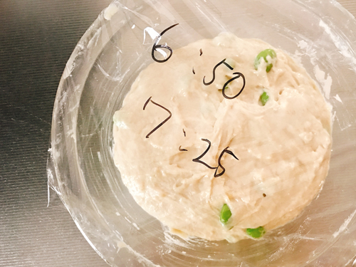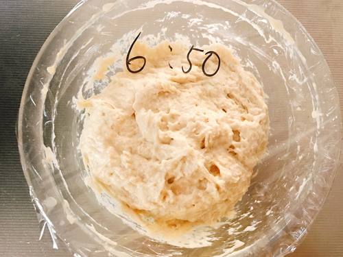 粉を振り、台に生地をあけ、ガスを抜き、密閉容器に入れ、野菜室で6時間ゆっくりと1次発酵。