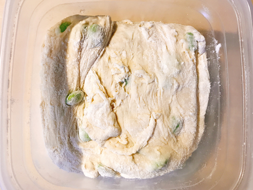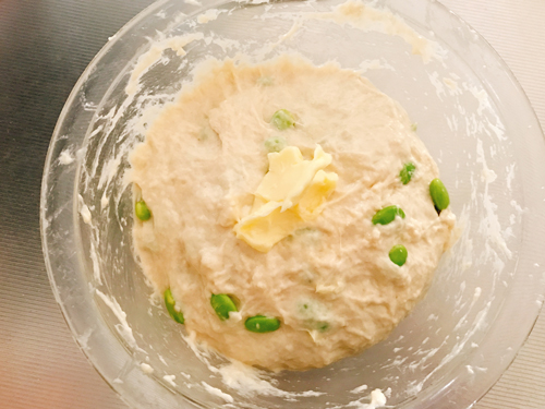 塩、枝豆を入れ、ボウルの中で手で70回ほどこねる。更にバターを入れ、しっかりと混ぜ込む。