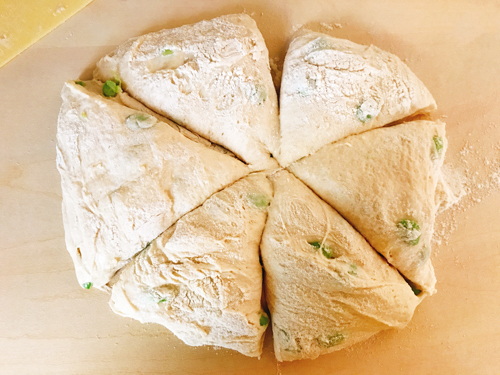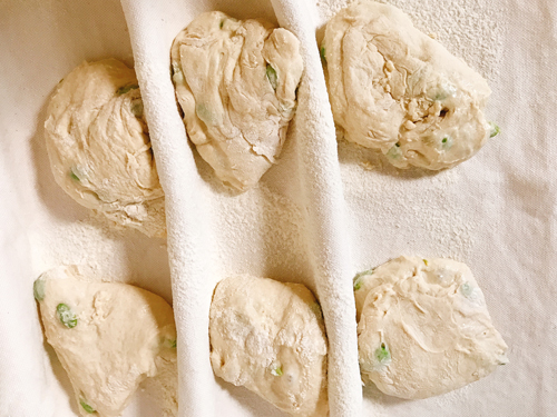 粉を振り、台に生地をあけ、6等分する。生地をやさしくまとめ、粉をたっぷり振ったキャンパス地に並べ上からラップをしてベンチタイム20分。