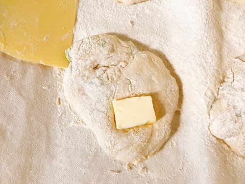 生地を少し平らにして、バターをのせ、生地を折りたたんだら、マドレーヌカップに入れる。