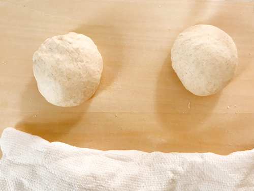 生地を4等分する。はりを持たせるように丸める。濡れ布巾を掛け、全体をビニール袋で覆い10分ほど休ませる。