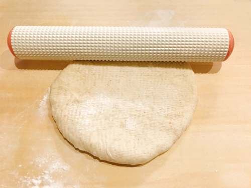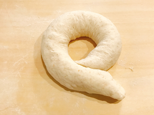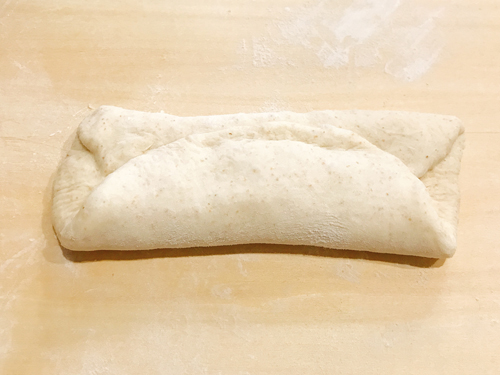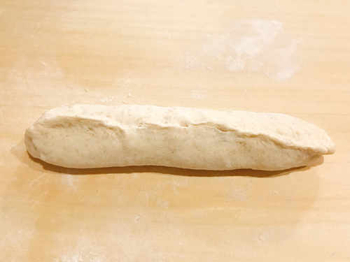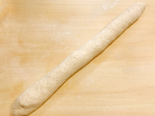 成形する。手で軽くつぶし、麺棒で伸ばし、三つ折にし、両端を付ける。転がして、棒状にする。