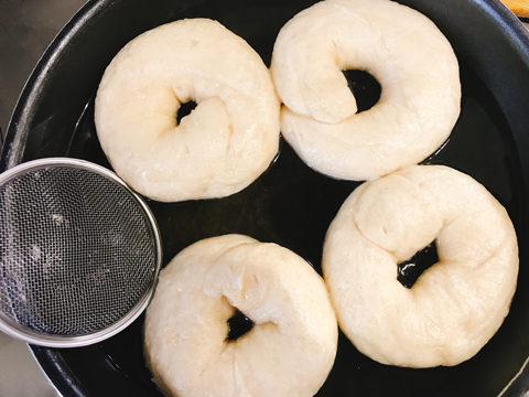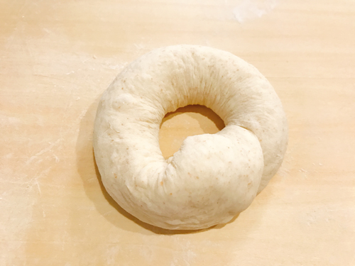 片方の端を少し残し輪にする。残した端をかぶせるように生地をつける。