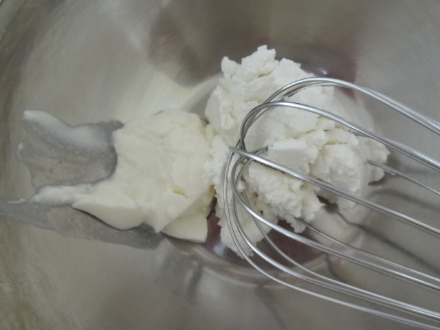 カッテージチーズとヨーグルトをボウルに入れ、泡だて器で混ぜる。