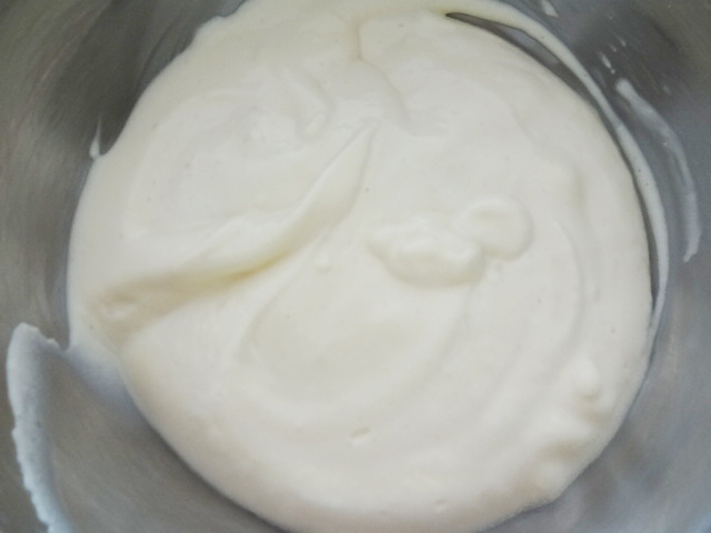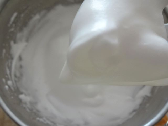(メレンゲを作る)別のボウルに卵白を入れグラニュー糖を少しずつ加えながら、ハンドミキサーで固いメレンゲを作る。