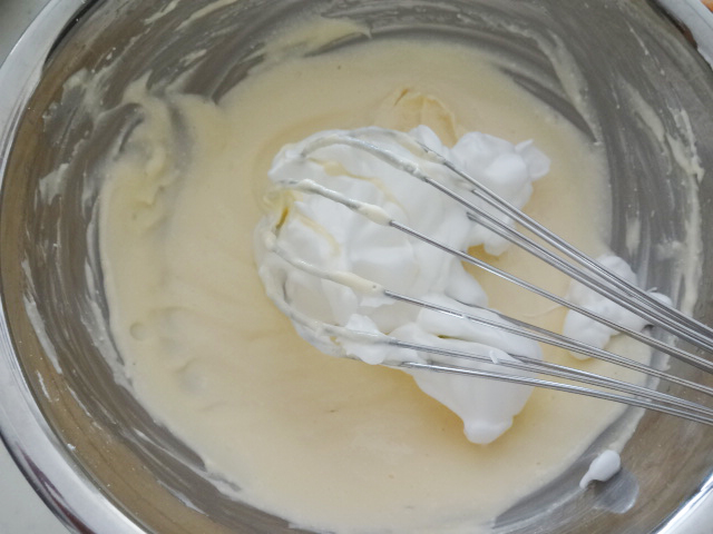 2にメレンゲをひとすくい入れ泡だて器で混ぜる。残りの生地を加えゴムヘラでサックリと混ぜる。