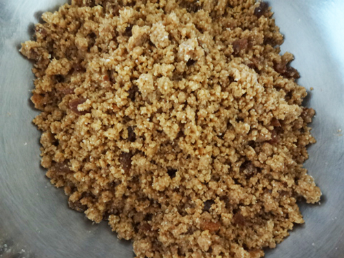 (クランブルを作る)合わせておいたクランブル用の粉類にバターを加え、バターを指で押しつぶすように粉類となじませて、そぼろ状になったら使うまで冷蔵庫で休ませる。
