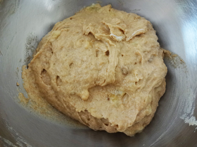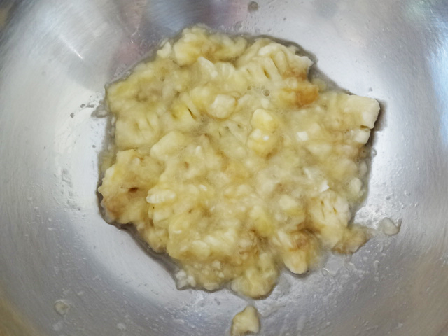 バナナは荒くつぶすことで、食べた時の全粒粉の口当たりが軽くなります。
