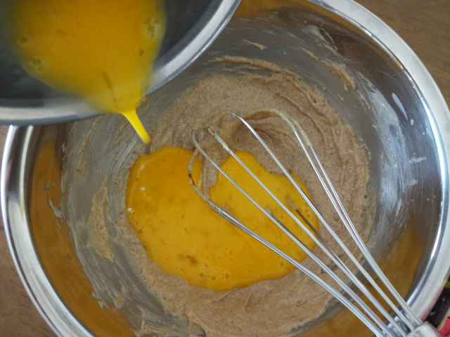 卵を溶いて、3に少しずつ加え混ぜる。シナモンも加える。