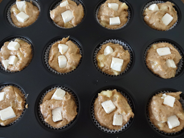 生地をマフィンカップに入れ、クリームチーズを3~4ケ生地に埋め込むようにのせる。