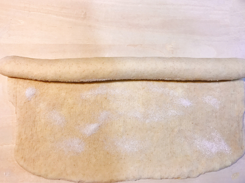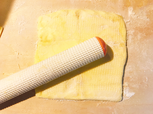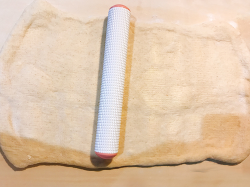 台に打ち粉を広げ、生地を置き、バターと生地がなじむように上から麺棒で全体を押し付ける。幅を変えずに、40cmくらいまで伸ばす。