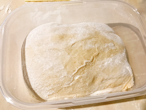 打ち粉をし、生地を取り出しガスを抜き、密閉容器にいれ、冷蔵庫で1時間休ませる。