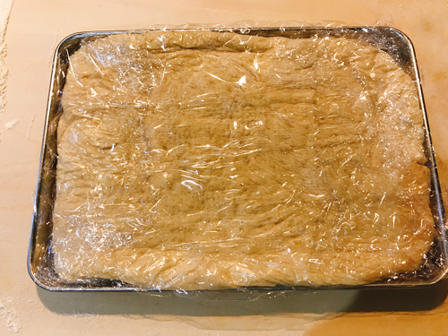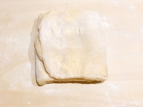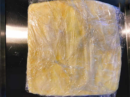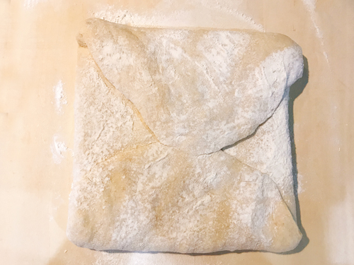 生地の向きを90度変え、5.6の作業を繰り返す。計3回折り込んだ後、ラップ、濡れぶきんで包みビニールに入れて、冷蔵庫で、1時間休ませる。