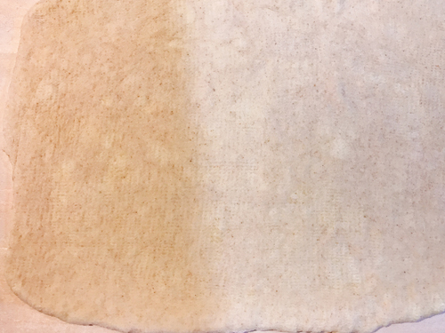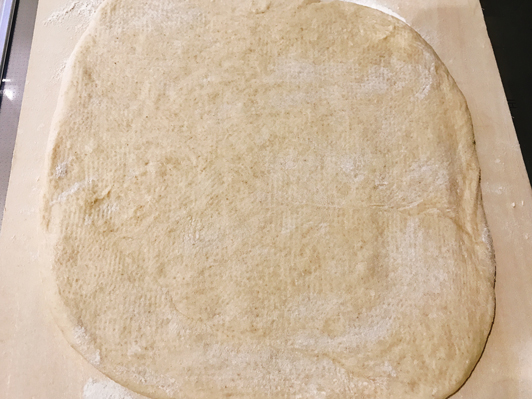 台に打ち粉をして、約40cm×27cmに伸ばす。