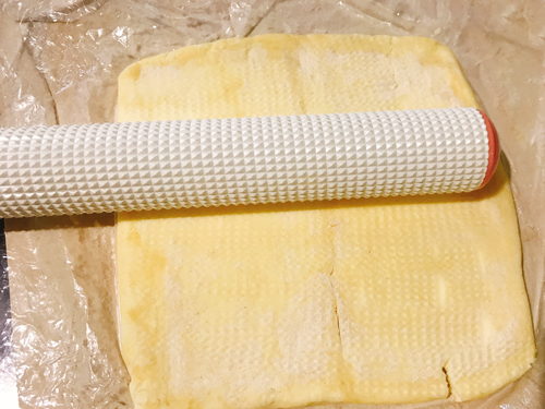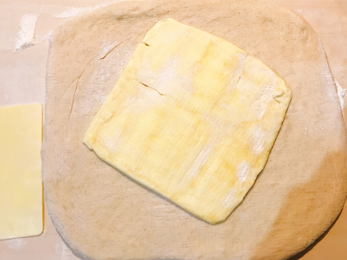 折込用のバターに打ち粉をまぶし、麺棒などでたたいて伸ばす。均一になったら、13cm四方に伸ばして、ラップに包み、使うまで、冷蔵庫で冷やしておく。