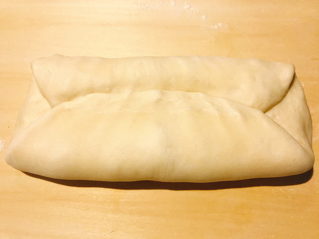 手粉をし、再度ガスを抜き、三つ折にする。更に両端をつけ、しっかり閉じる。