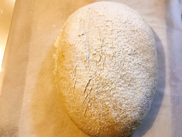 上から茶漉しで粉を振り、スケッパーで周りをはがし、ボウルを逆さにして、台に生地を出す。