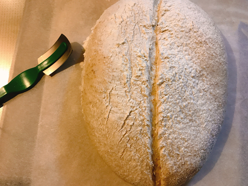 生地に粉を茶漉しで振り、クッキングシートを敷いた天板にクッキングシートを巻きつけた板を使ってのせ、クープを1本入れる。