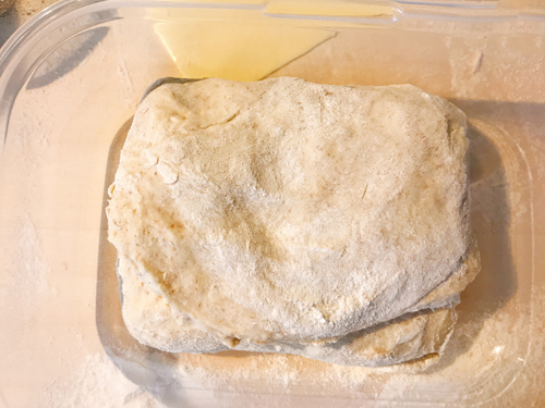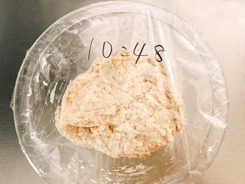 分量の塩を振り入れ、周りから畳むように混ぜる。70回ほど。ラップをして30分休ませる。