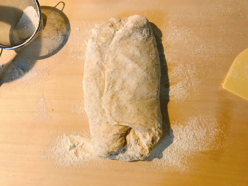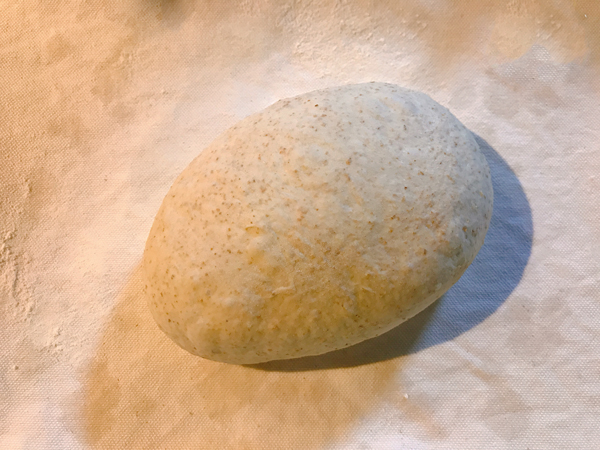 生地を丸めなおすベンチタイム30分。ラグビーボール型成形する。粉を振り、キャンパス地にのせ。