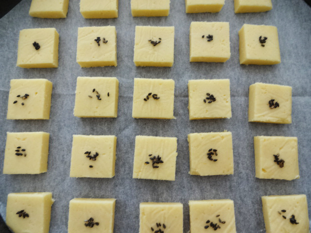 オーブンペーパーを敷いた天板に並べ、黒ゴマを少量つける。