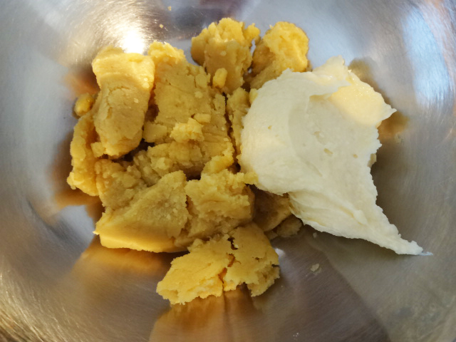 別のボウルに芋あんを入れ、そこへ3の生地をひとすくい加えのばしてから残りの3へもどし混ぜる。