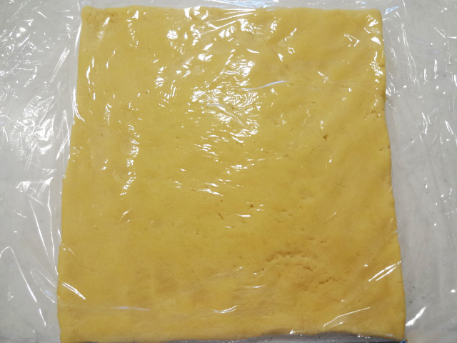 生地を取り出し半分にして、厚さ8mm15cm×15cmに成形する。
