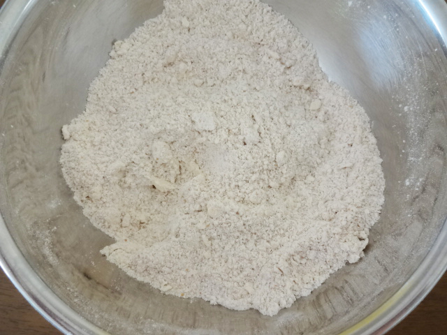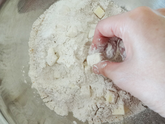 ボウルにふるった粉類とよく冷やした角切りバターを入れ、指でバターをつぶすように粉と合わせる。