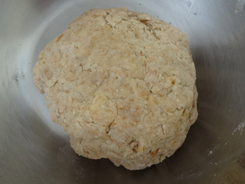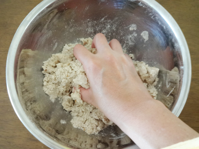 全体にホロホロの砂状になったら刻んだくるみと牛乳を加えゴムベラでさっくりと混ぜる。