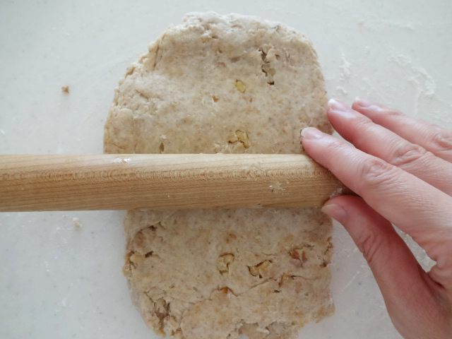 打ち粉(分量外)をした台に生地を置き、綿棒で15cmほどのばしたら半分に折り向きを変えて再び綿棒でのばす。10回ほど繰り返す。