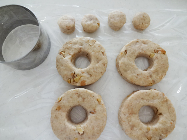 1.5cm厚にのばし7cmの抜き型で抜き、中央を2.5cmの抜型で抜く。