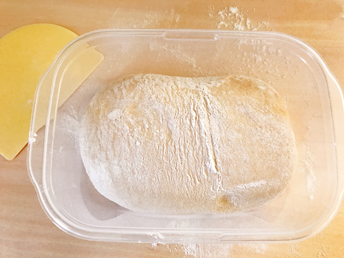 ホームベーカリーにイーストまでの生地の材料を全て入れ、1次発酵まで行う。打ち粉をして、生地を台に出し、三つ折にして密閉容器に入れ、野菜室で1時間ほど休ませる