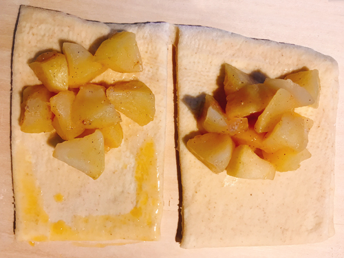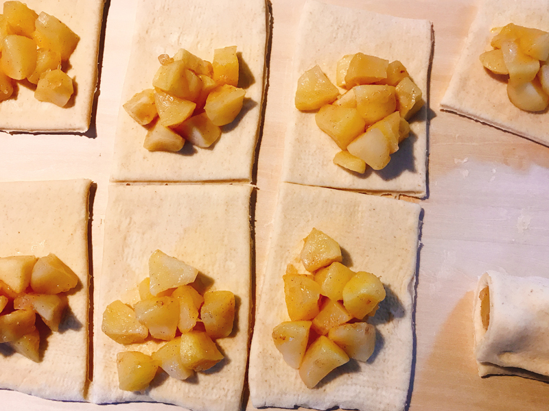 台に打ち粉をして、38cm×28cmに伸ばす。8等分に切りりんごの甘煮をのせる。