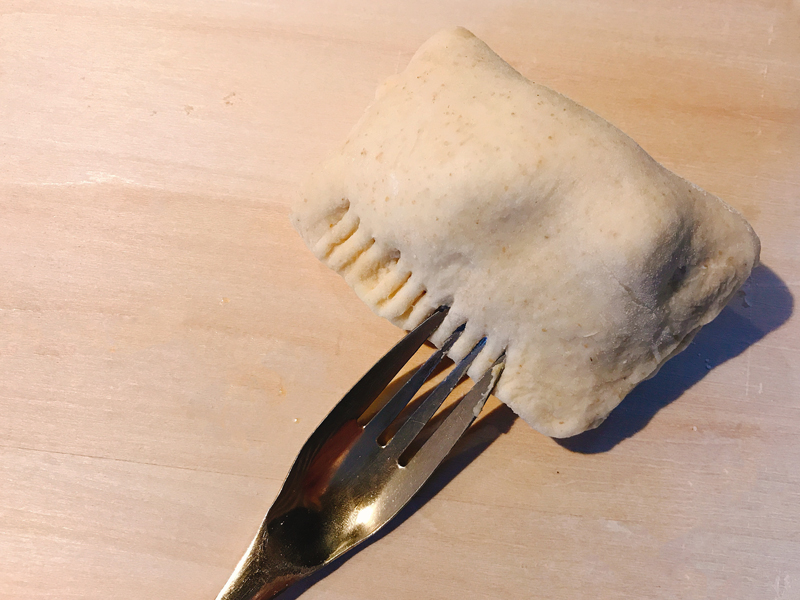 縁に卵液を塗り、折りたたんでフォークでしっかりととじる。