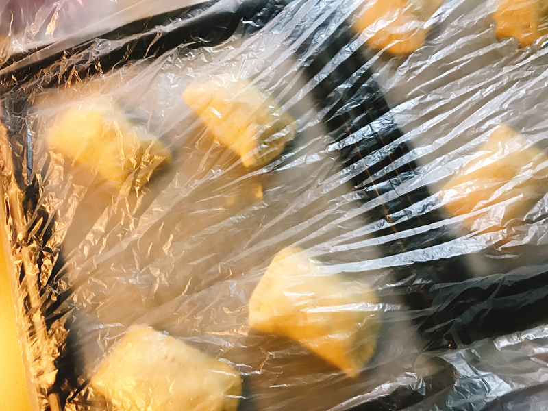 三つ折にしたら、ラップで包みビニール袋に入れて冷凍庫で15分休ませる。