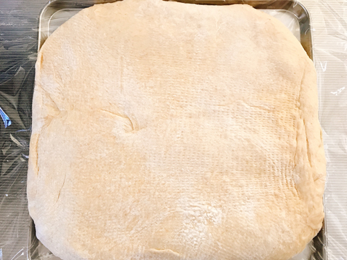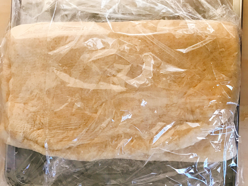 打ち粉をし、生地を取り出しガスを抜き、17cm四方に広げ、ラップに包んで、ビニール袋に入れ、冷凍庫で5分休ませる。