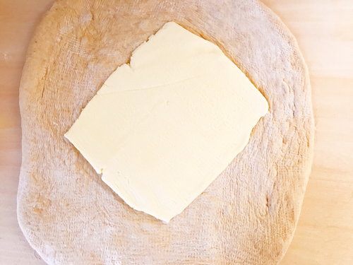 生地を台の上に広げ、生地と硬さを均一にした折込バターを斜めにのせる。生地を中心に向かってたたみ、しっかりとじる。