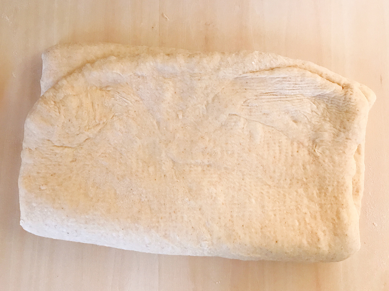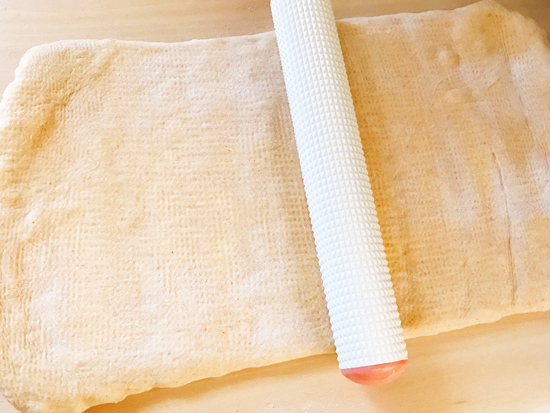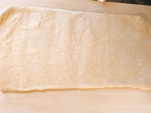 台に打ち粉を広げ、生地を置き、バターと生地がなじむように上から麺棒で全体を押し付ける。幅を変えずに30cmくらいまで伸ばす。