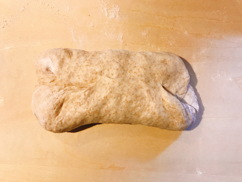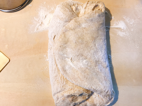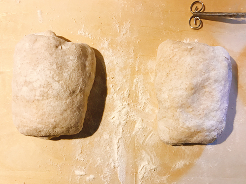 生地を2等分して、三つ折にして、天板に並べる。ビニール袋で包み、ベンチタイム30分。