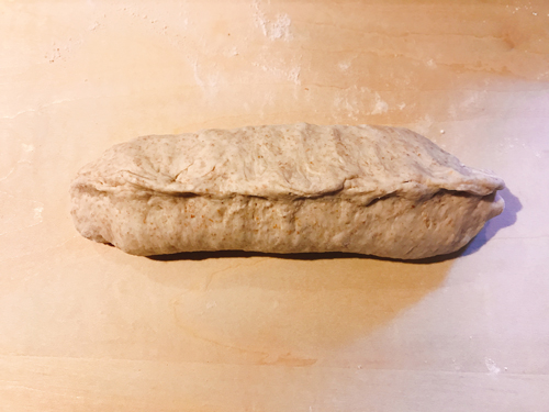 カードで生地を台に戻す。1/3真ん中でたたみ、生地の端を指で押さえる。下1/3も真ん中でたたんで指で押さえ、更に半分に折り指で押さえ、端をつまんでとじ目をしっかりとじる。ころころと転がし25cmくらいの棒状にする。