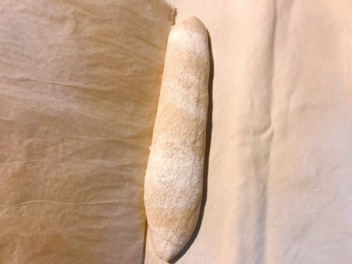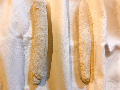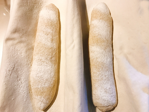 下に天板を敷いたキャンパス地に粉を振り、生地を離して並べる。生地と生地がくっつかないようにキャンパス地にひだをつけて、生地に付かないように天板ごとビニール袋で包み、生地が乾かないように2次発酵30分。