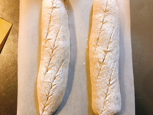 生地に茶漉しで粉を掛ける。オーブンペーパーの板を使って生地を移しクープを3本入れる。