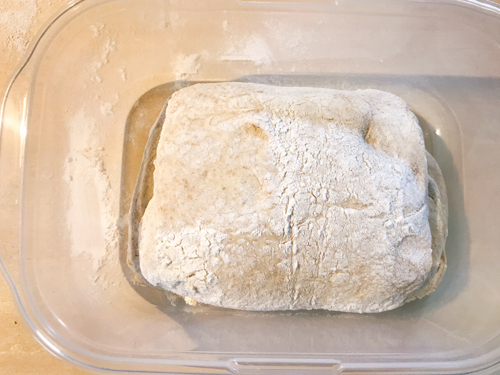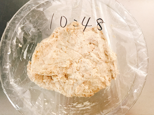 分量の塩を振り入れ、周りから畳むように混ぜる。70回ほど。ラップをして、30分休ませる。